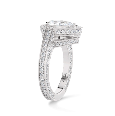 Questo anello realizzato in oro bianco riciclato 18 KT incastona 1 diamante AMA taglio goccia da 1 ct, 112 diamanti AMA taglio brillante da 0.01 ct e 82 diamanti AMA taglio brillante da 0.005 ct per una caratura totale di 2.46 ct