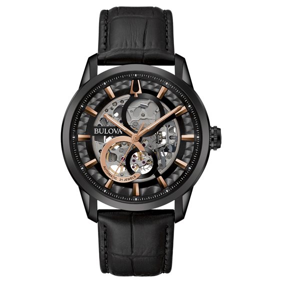 Orologio Solo Tempo Bulova Meccanico modello Sutton Scheleton. Cassa in acciaio lucido con particolare satinato e trattamento nero, fondo con vista movimento. Movimento meccanico automatico 21 rubini riserva di carica 40 ore. Quadrante con vista movimento scheletrato, indici e lancette luminescenti placcati oro rosa con bordo grigio e nero. Vetro minerale. Cinturino in pelle nera stampa alligatore, fibbia dèployante con pulsanti. Impermeabile 3 bar (3 atm). Scatola libretto istruzioni e garanzia 3 anni originali.