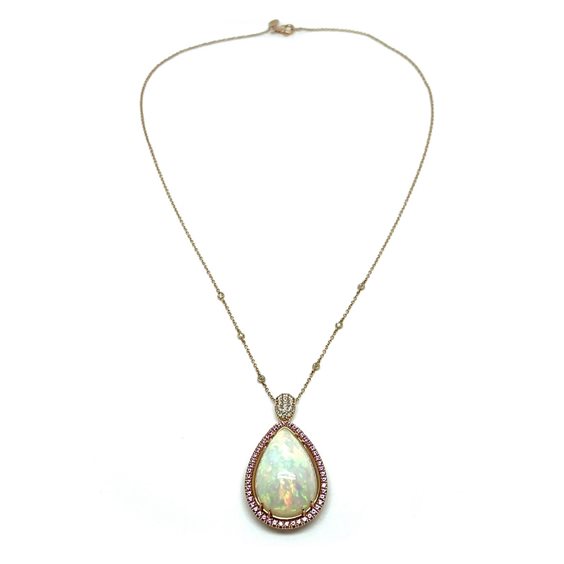 Girocollo in oro rosa 18kt con diamanti ct 0.27 colore F purezza Vs. Pendente con opale ct 15.89 e zaffiri rosa ct 0.46.