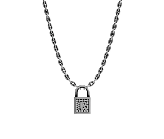 Collana con pendente a forma di lucchetto, impreziosito da un pavé di diamanti che incorniciano le iniziali "JR" al centro. La catena a maglia spessa è dotata di una chiusura a moschettone sicura e resistente.