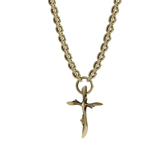 Collana con pendente a croce dal design scolpito e linee irregolari, abbinato a una catena a maglia rotonda.