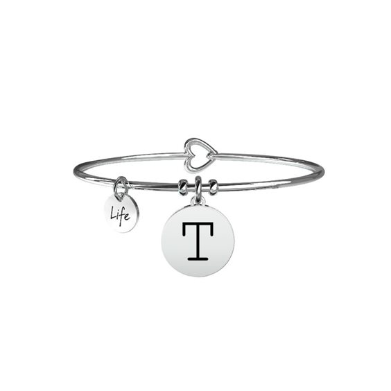 Bracciale Kidult in acciaio ipoallergenico con pendente rotondo con lettera T incisa