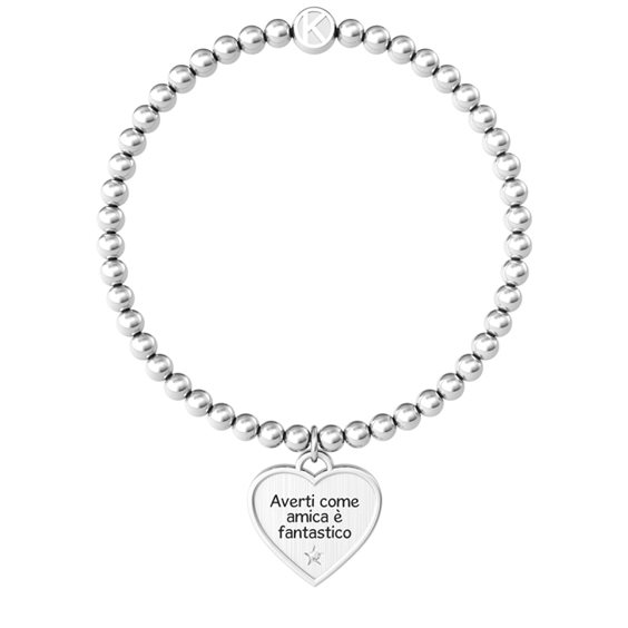 Bracciale Kidult elastico con sfere in acciaio 316L e ciondolo satinato a cuore con cristallo.Incisione smaltata e cristallo sul ciondoloDimensione del cuore: 19,4 x 19,9 mmMisura unica, lunghezza 17 cm