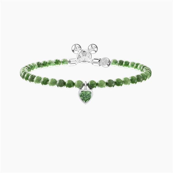 Bracciale in acciaio 316L, lunghezza regolabile da 16 a 25 cm, con catena veneta, diaspro imperiale verde striato e cristallo verde taglio cuore. Dimensioni: catena 2 mm, cuore 5x5 mm, pietre Ø 4 mm