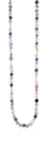 COLLANA CON PERLE FW, AMETISTA, AGATA ROSA, ACQUAMARINA MILK ED ELEMENTI IN ARGENTO.
