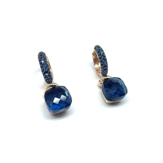 Orecchini in argento 925% con galvanica in oro rosa. Orecchini con quarzo idrotermale e zirconi azzurri.