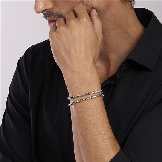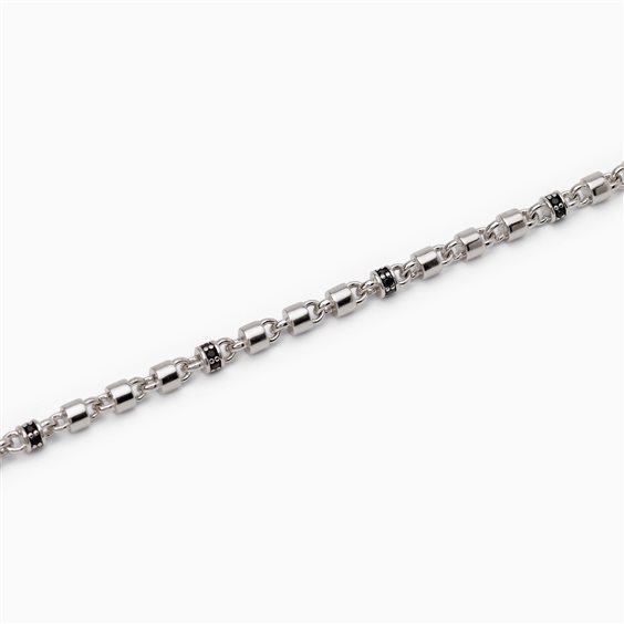 Bracciale in argento 925/°°° finitura rodiata, catena cilindretti Ø 4 mm e inserti con zirconi neri Ø 1.50 mm, lunghezza regolabile da 18.5 a 21 cm.