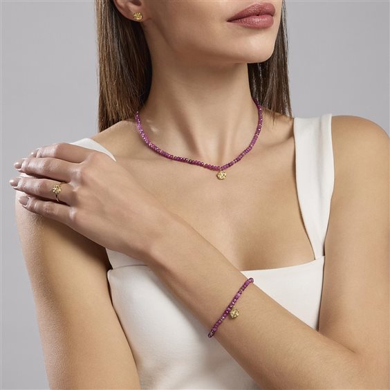 Girocollo in argento 925/°°° dorato con rubino Ø 3.5 mm, ciondolo rosa satinata con zircone bianchi Ø 1.75 mm, lunghezza regolabile da 40 a 45 cm.