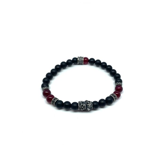 BRACCIALE ARTIGIANALE MADAME BLACK CON ELEMENTI IN ARGENTO 925%, ONICE NERO OPACO E QUARZO CILIEGIA.