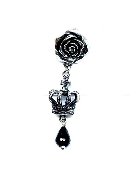 ORECCHINO MONO ARTIGIANALE FIRMATO MADAME BLACK. IN ARGENTO 925 BRUNITO CON ROSA, CORONA E GOCCIA DI ONICE NERO LUCIDO SFACCETTATO. REALIZZATO A MANO.