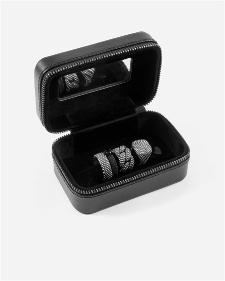 Custodisci i tuoi gioielli nel nuovissimo portagioie Nove25, un astuccio prezioso in due versioni eleganti e compatte. Portagioie piccolo da viaggio, materiale ecopelle Pu, colore nero, misura 11x5hx7 cm, inserto serpente in zama, logo a pressa sul dorso, tirazip ennagono e zip bruniti. Interno in floccato nero con cucitura e bottone e specchietto.