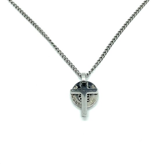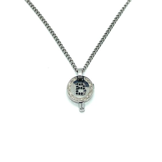 Catenina in bronzo color argento. Chiusura non regolabile color bronzo. Ciondolo con iniziale B in zirconi neri e ciondolo croce.