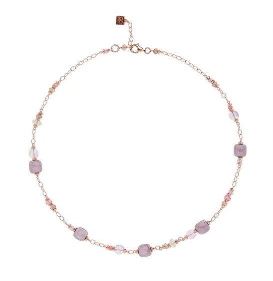 Girocollo in legno d’ulivo di recupero laccato e smaltato a mano, argento 925 placcato oro rosa e mix di pietre naturali. Lunghezza regolabile da 43 cm a 46,5 cm.