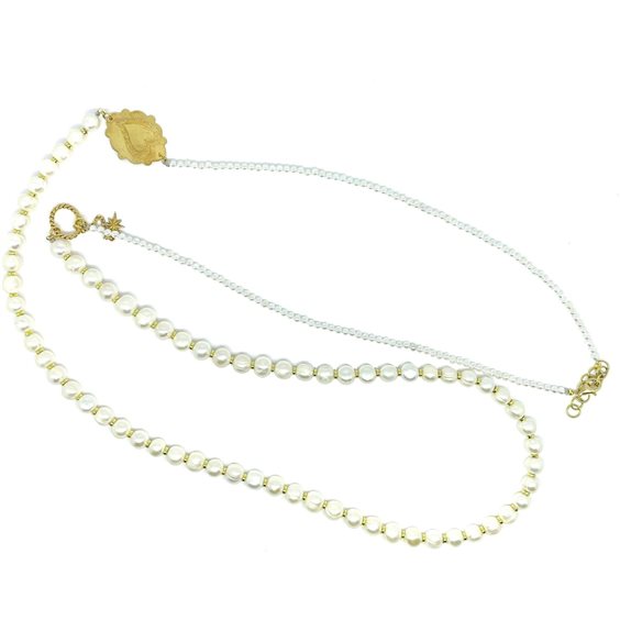 Collana artigianale Sacramore con elementi in argento 925% con galvanica in oro giallo. Collana con perle naturali.