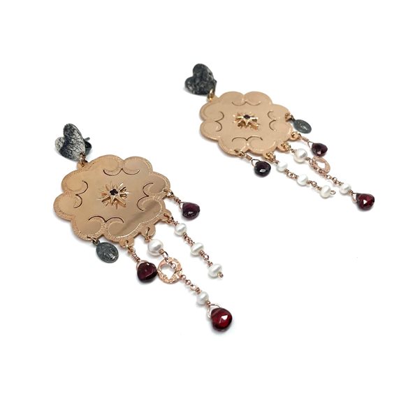 Orecchini artigianali in argento 925% con galvanica in oro rosa con granato.