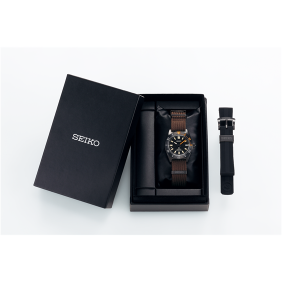 Questa moderna reinterpretazione dell'orologio subacqueo del 1965 è dotata del calibro 6R35, che offre una riserva di carica di 70 ore. Il suo quadrante e la lunetta sono punteggiati da dettagli arancioni che ricordano i riflessi della luce che brilla sotto il mare di notte. Gli indici e le lancette sono rivestiti di Lumibrite per garantire una leggibilità ottimale anche nelle condizioni di minor visibilità. L'orologio è dotato di un cinturino in tessuto che incorpora una tecnica di tessitura tradizionale giapponese chiamata Seichu. Inoltre, è offerto con un cinturino aggiuntivo in silicone nero perfetto da abbinare a tanti outfit diversi e indossare in molteplici contesti diversi tra loro.