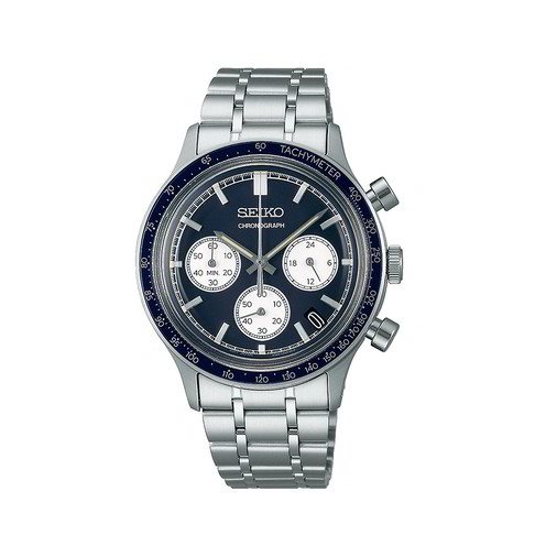 Orologio SPORT ~ Cronografo al quarzo. Questo orologio al quarzo della collezione Seiko SPORT offre una serie di funzioni. Il quadrante blu intenso presenta tre contatori cronografici ed è circondato da una lunetta tachimetrica. Realizzato interamente in acciaio inossidabile, questo modello è anche molto resistente grazie al vetro Hardlex, al fondello avvitato e all'impermeabilità fino a 100 metri.