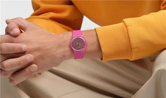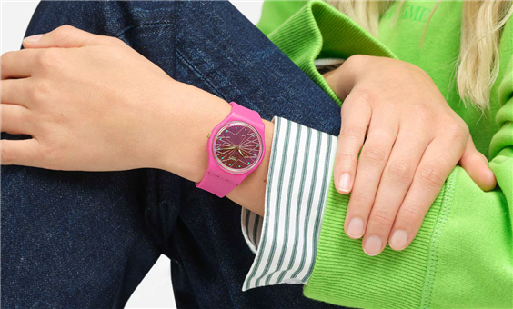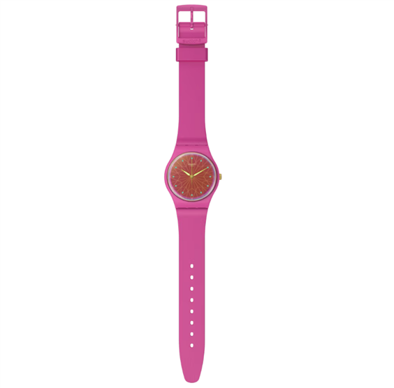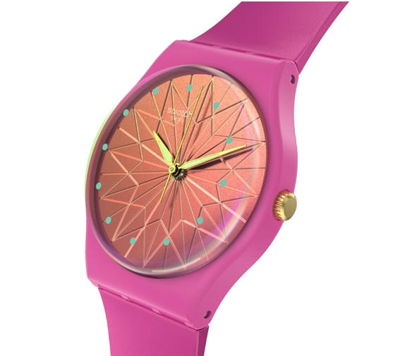 Questo orologio rosa neon presenta un quadrante laccato con incisioni a forma di stella, lancette dorate che si illuminano al buio e una cassa in materiale biosourced. Il vetro biosourced è caratterizzato da un effetto Solar Spectrum e lancette delle ore stampate, mentre la corona dorata accentua l'effetto Anodamazing del cinturino rosa opaco.
