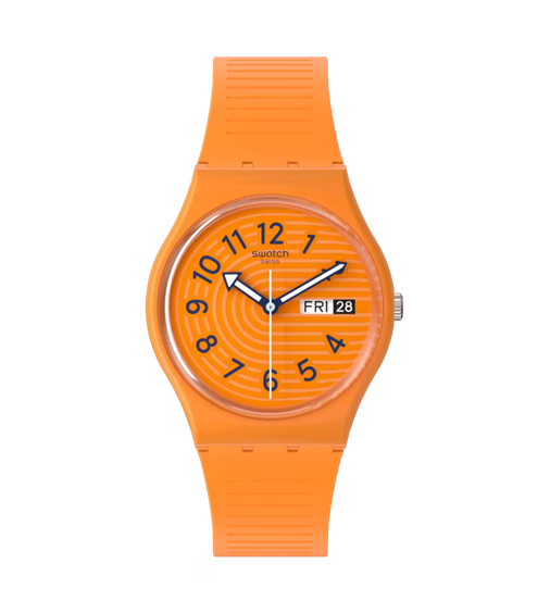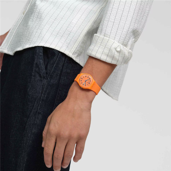 Il quadrante di questo orologio arancione presenta numeri blu scuro stampati e una struttura arancione scuro in una cassa con vetro biosourced. Le lancette fosforescenti indicano l'ora e la finestra della data si trova a ore 3. Il cinturino, il passante e la fibbia arancione abbinati creano una splendida combinazione tono su tono. SO28O703