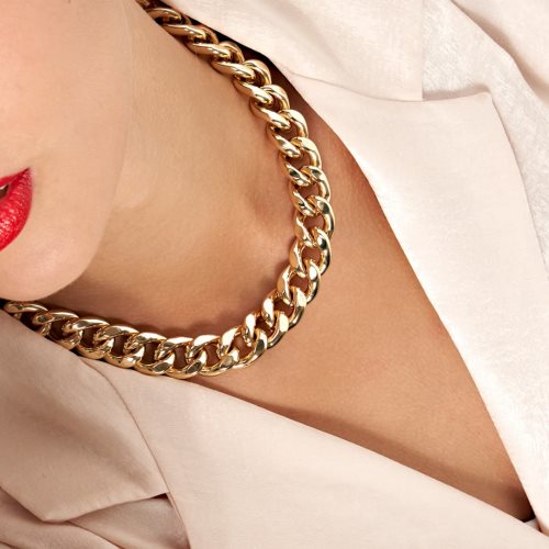 Elegante collana di catena grumetta in bronzo con bagno in oro giallo 24k, finitura battuta e chiusura a T-bar. Una collana d'effetto, sofisticata ed elegante, perfetta per stupire con classe. Lunghezza 45 cm.